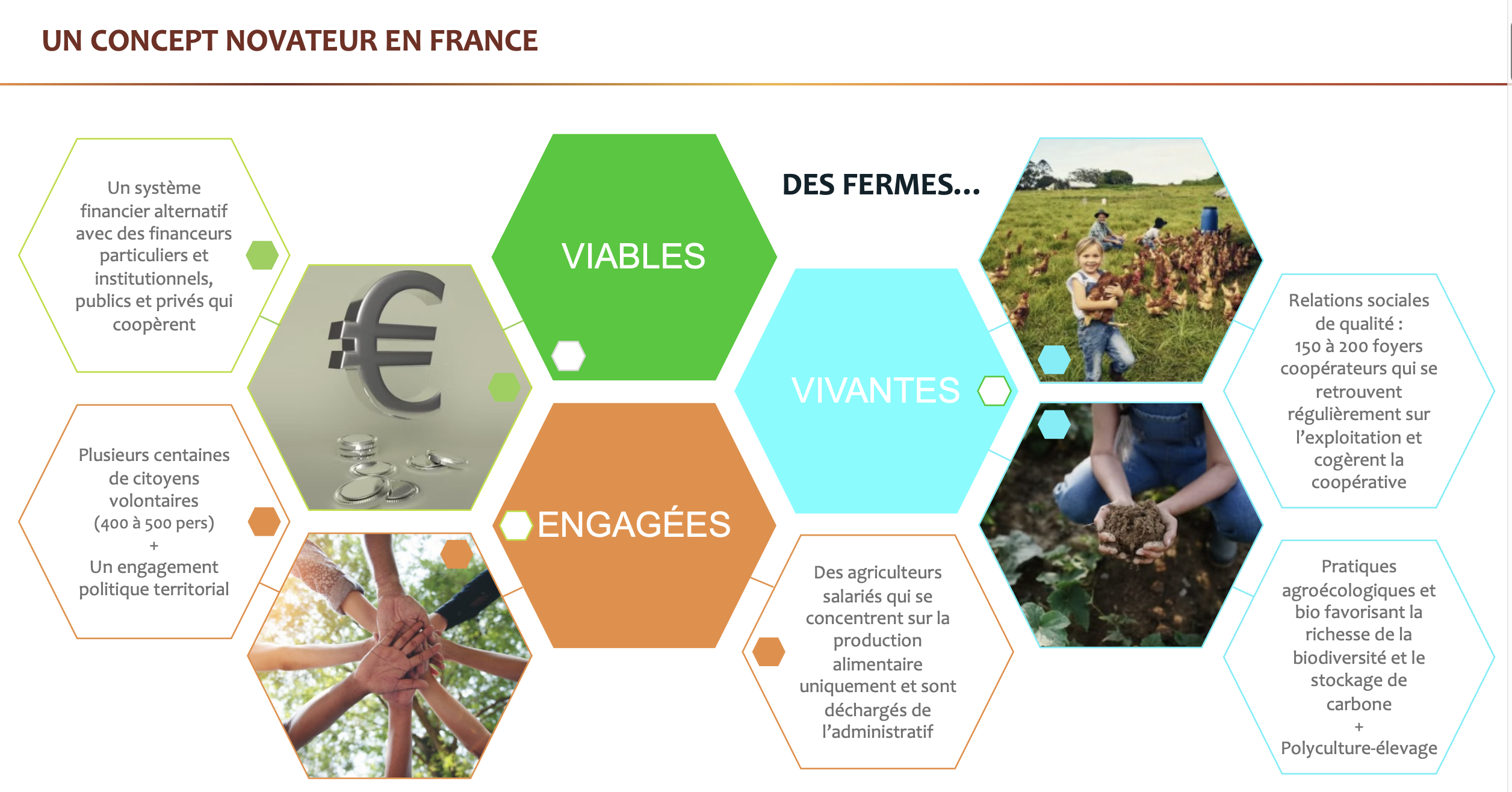 > Création de coopératives vivrières agroécologiques en polyculture-élevage à proximité des villes pour développer la résilience alimentaire en France et répondre aux différentes crises environnementales, culturelles et alimentaires.